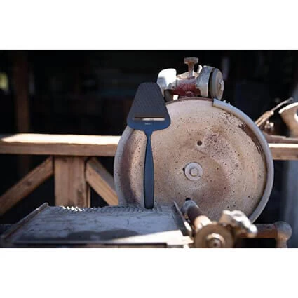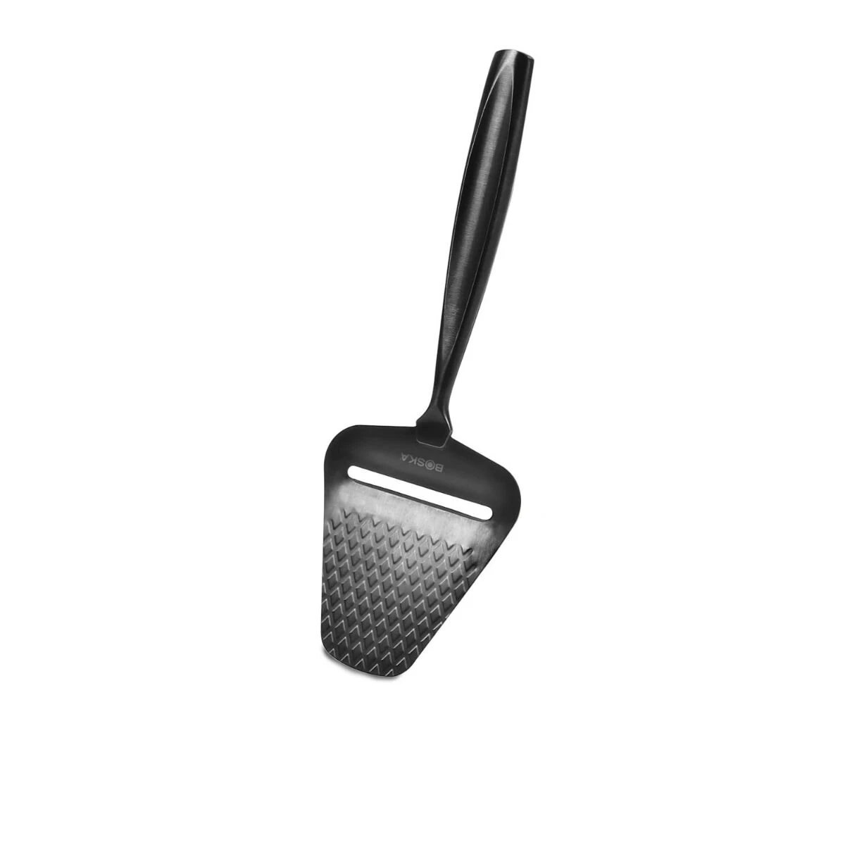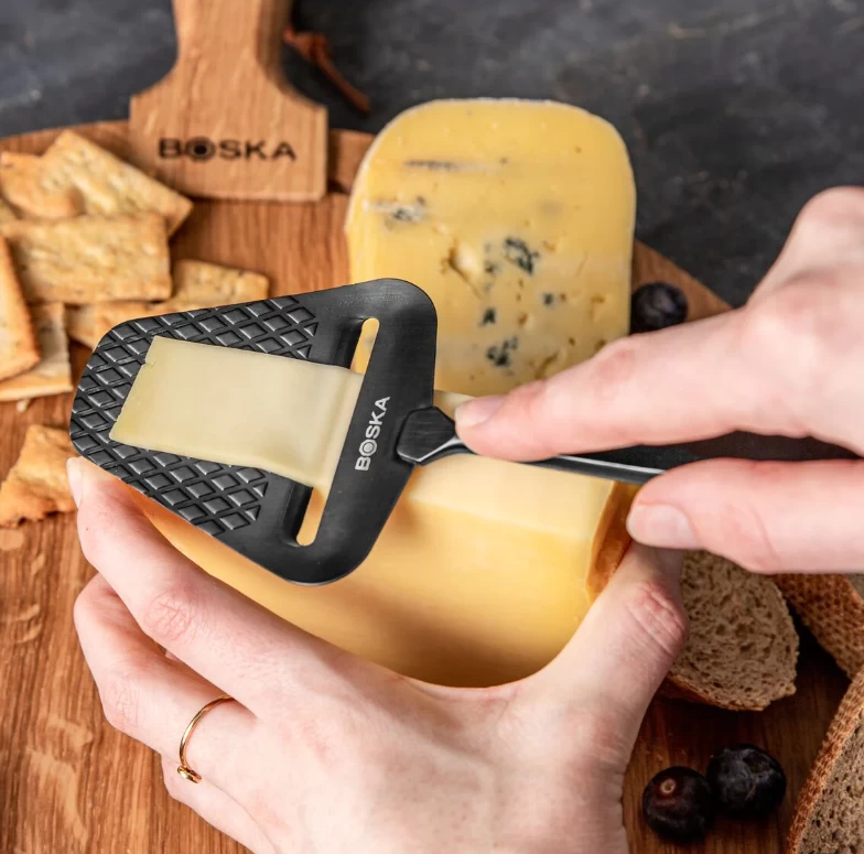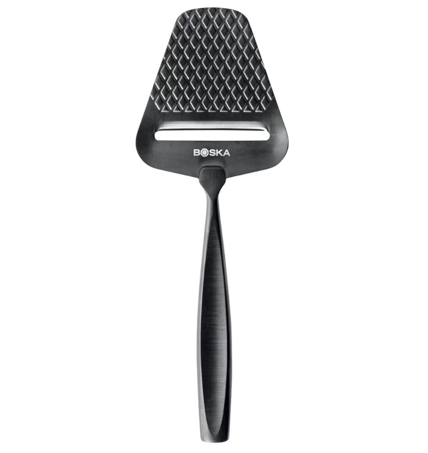 De donkergrijze Boska Monaco+ kaasschaaf is vervaardigd uit roestvrij staal. Het blad van de schaaf is voorzien van een anti-kleefcoating en een ruitpatroon. Hierdoor blijft ook halfharde kaas niet aan het blad kleven.