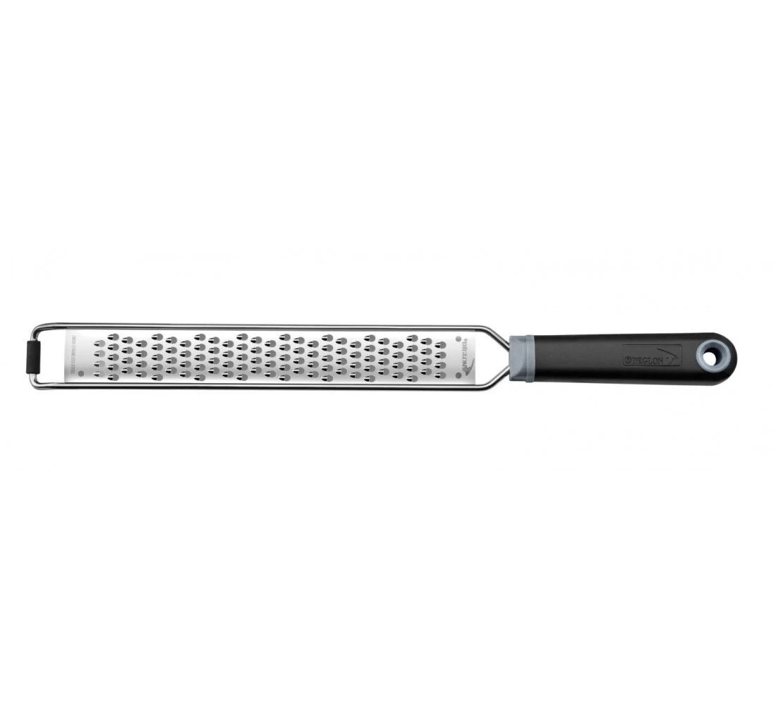 De Deglon grove rasp is gemaakt van roestvrij staal en heeft een zwarte handgreep met extra grip. Door het grove rasp-oppervlak is de rasp erg geschikt voor harde ingrediënten. Gebruik de rasp om kazen, wortel, chocolade of komkommer te raspen. Omdat de rasp langwerpig is, is deze ook erg geschikt voor het raspen van citrusschil. Het rasp-oppervlak is 22 x 2,8 cm en aan het uiteinde zit een anti-slip huls, zodat de rasp goed op het werkblad blijft staan.