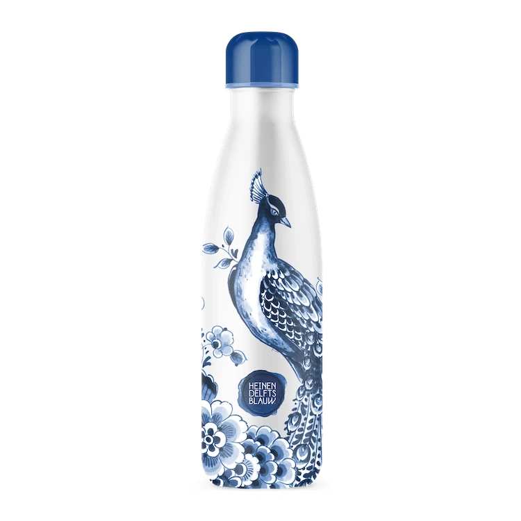 De IZY Bottles x Heinen Delfts Blauw drinkfles Peacock is gemaakt van roestvrijstaal en heeft een inhoud van 500 ml. Gebruik de IZY drinkfles voor het meenemen en op temperatuur houden van zowel warme als koude dranken. Dankzij de dubbele wand houdt de fles koude dranken tot wel 24 uur koud en warme dranken tot wel 12 uur warm.