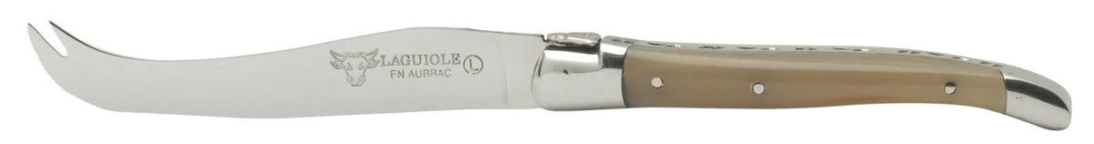 Het Laguiole en Aubrac kaasmes heeft een lemmet van messenstaal met een lengte van 10 cm. Het heft is van beige hoorn. Het totale mes is 20 cm lang. Het gebruikt het kaasmes voor het snijden van kazen. Met het getande uiteinde prikt u kaas eenvoudig op het mes.