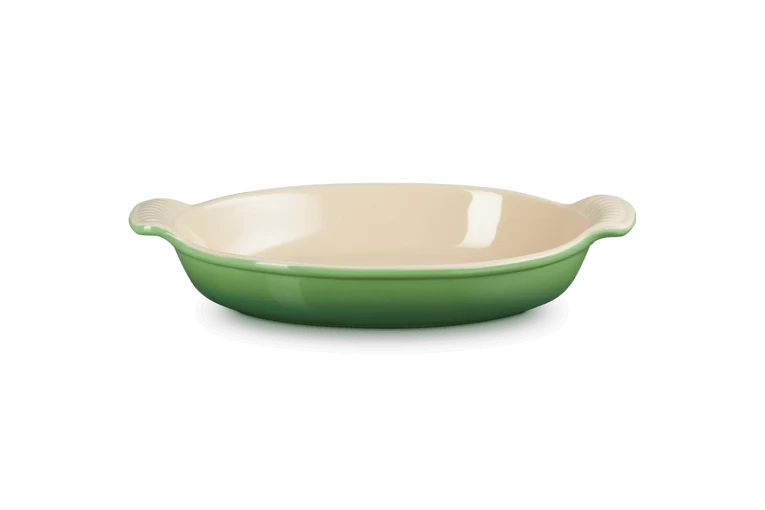De ovale Le Creuset ovenschaal is gemaakt van groen geglazuurd aardewerk en is 28 cm lang. De inhoud bedraagt ongeveer 1,6 liter. Bereid en serveer in de ovenschaal gerechten zoals lasagne, gebraden gevogelte en aardappelgratin.