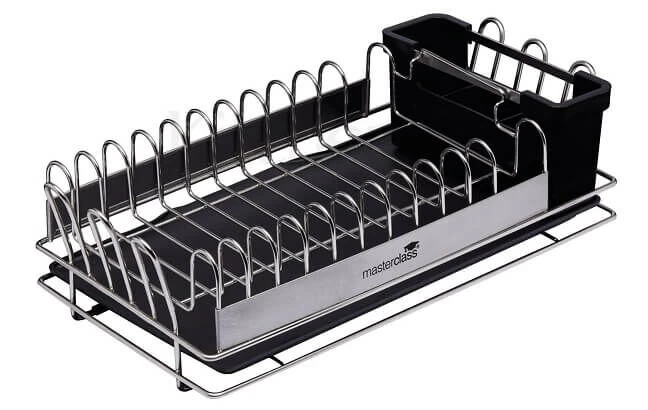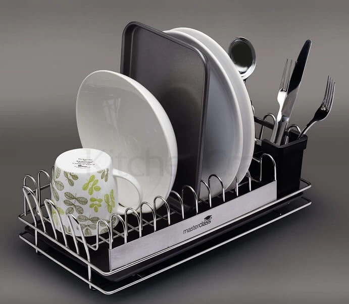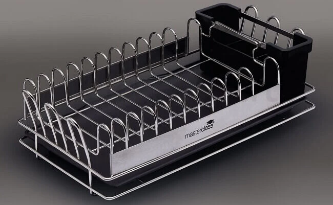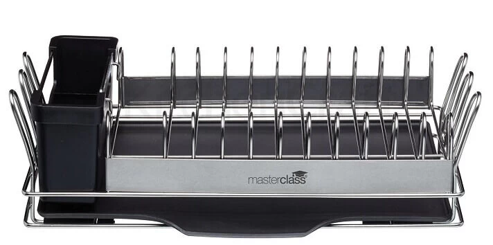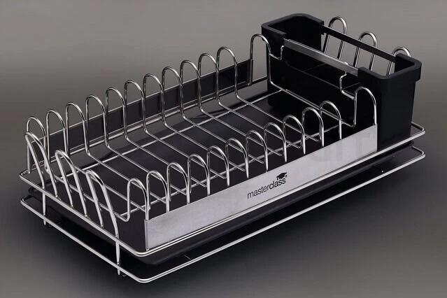 Het roestvrij stalen afdruiprek van MasterClass is een duurzame keuze voor dagelijks gebruik. Dankzij het slanke formaat van 41 cm x 22 cm is hij perfect geschikt voor een 1-/2-persoons huishouden, of een kleine afwas tussendoor. Het afdruiprek wordt gecombineerd met een opvangblad van stevig zwart kunststof: opgevangen water verdwijnt hierdoor probleemloos in de gootsteen. De pootjes zijn voorzien van beschermende anti-slip voetjes die ontsierende krassen helpen voorkomen. Zo is het rek optioneel ook zonder blad te gebruiken. Het rek wordt compleet geleverd met verwijderbare bestekbak.