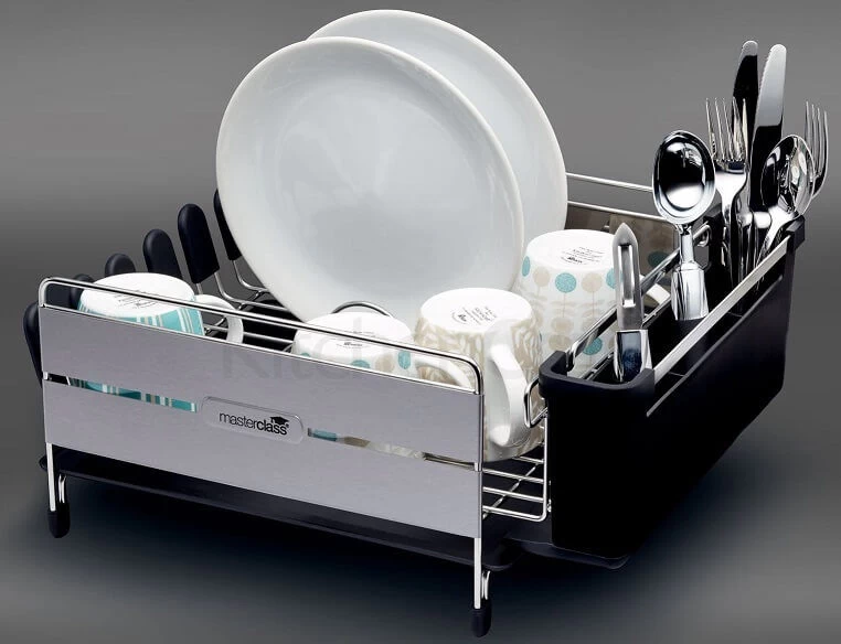 Het roestvrij stalen afdruiprek van MasterClass is een duurzame keuze voor dagelijks gebruik. Dankzij het ruime formaat van 44 cm x 34 cm biedt hij ruimte aan al uw servies, glaswerk en bestek. Het afdruiprek wordt gecombineerd met een opvangblad van stevig zwart kunststof: opgevangen water verdwijnt hierdoor probleemloos in de gootsteen. De pootjes zijn voorzien van beschermende anti-slip voetjes die ontsierende krassen helpen voorkomen. Zo is het rek optioneel ook zonder blad te gebruiken. Het rek wordt compleet geleverd met verwijderbare bestekbak.