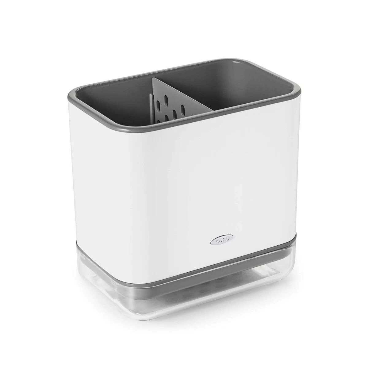 De gootsteenorganizer van OXO Good Grips is vervaardigd uit kunststof. De lengte van de gootsteen-organizer is 14,5 cm, de breedte 9,7 cm en de hoogte is 13,6 cm. Handig om uw vaatdoekje, afwasborstel en schuursponzen in op te bergen.