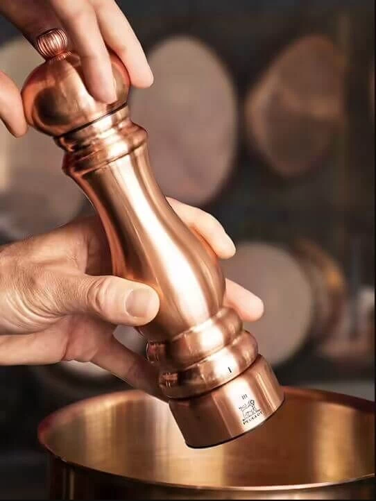 De Peugeot Paris Chef pepermolen heeft het klassieke Peugeot model dat is herzien. De molen heeft een roestvrijstalen bekleding met koper kleur. Hierdoor krijg de 22 cm hoge molen een moderne en chique uitstraling, en is het niet vatbaar voor uitdroging. Het maalwerk in de molen is vervaardigd uit roestvrij staal. De molen is voorzien van u-select, waarmee u de grofheid van de korrel traploos kunt instellen. Op de metalen draaiknop bovenop bevindt zich de het logo van Peugeot.
