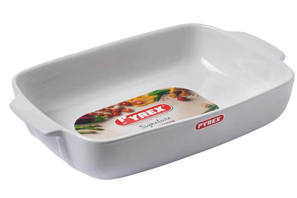 De Pyrex Signature ovenschaal bevat een geglazuurde coating waardoor ingrediënten niet aan de schaal blijven plakken. Het aardewerk van Pyrex is bestand tegen temperaturen tot 250°C. De rechthoekige ovenschaal van Pyrex is vaatwasmachinebestendig, maar het wordt aangeraden om te reinigen door middel van warm water, afwasmiddel en af te drogen met een zachte doek.